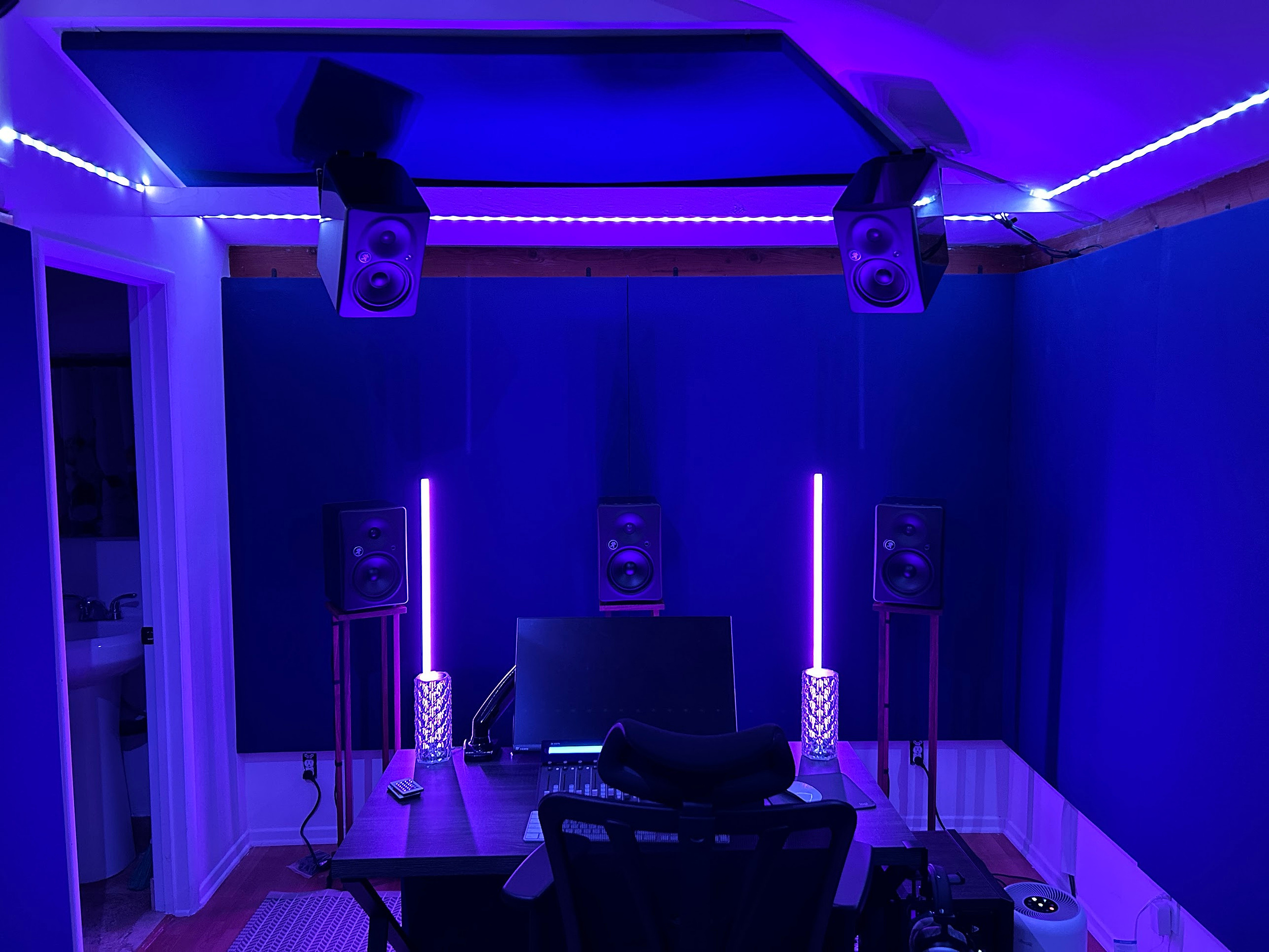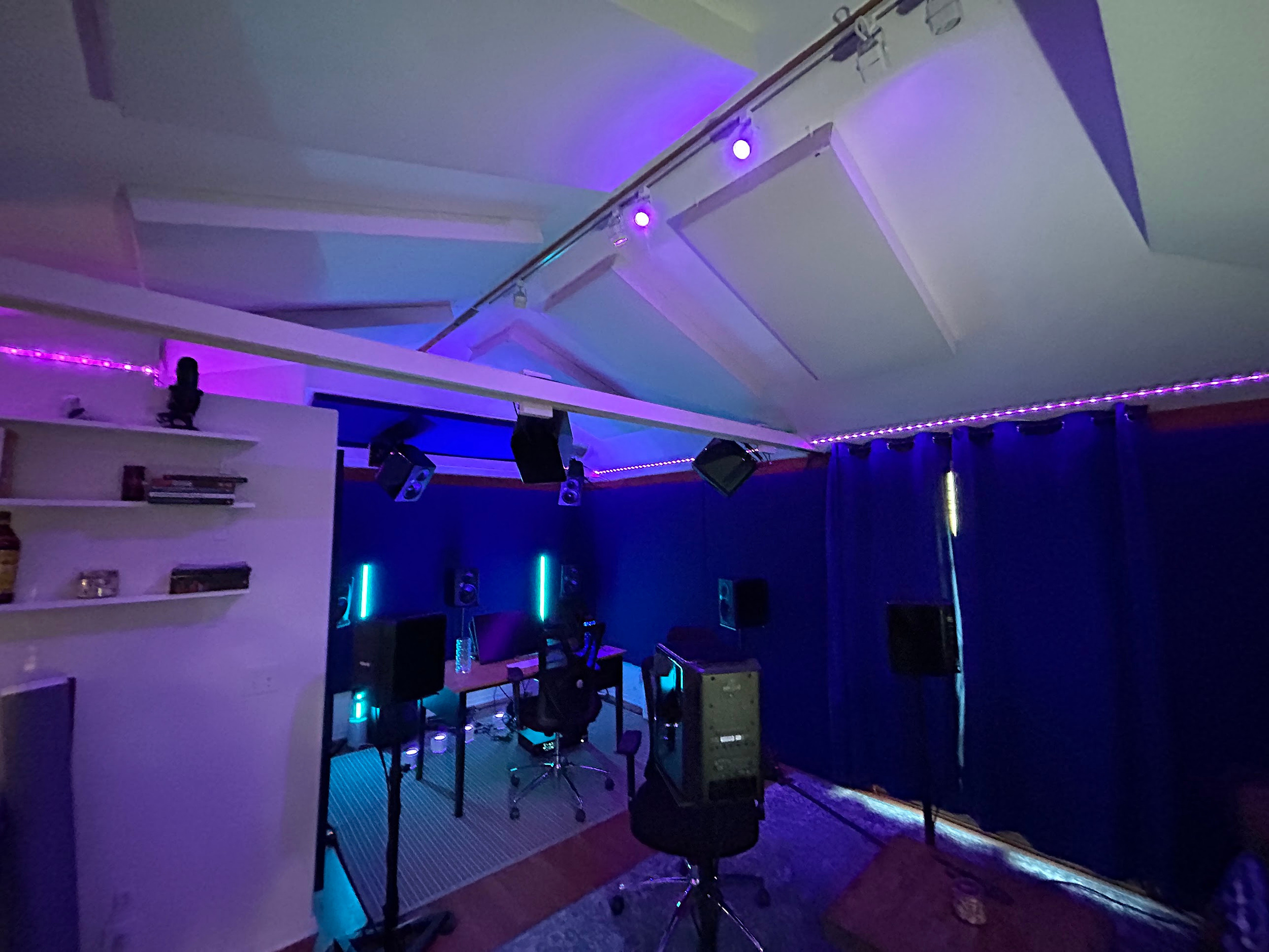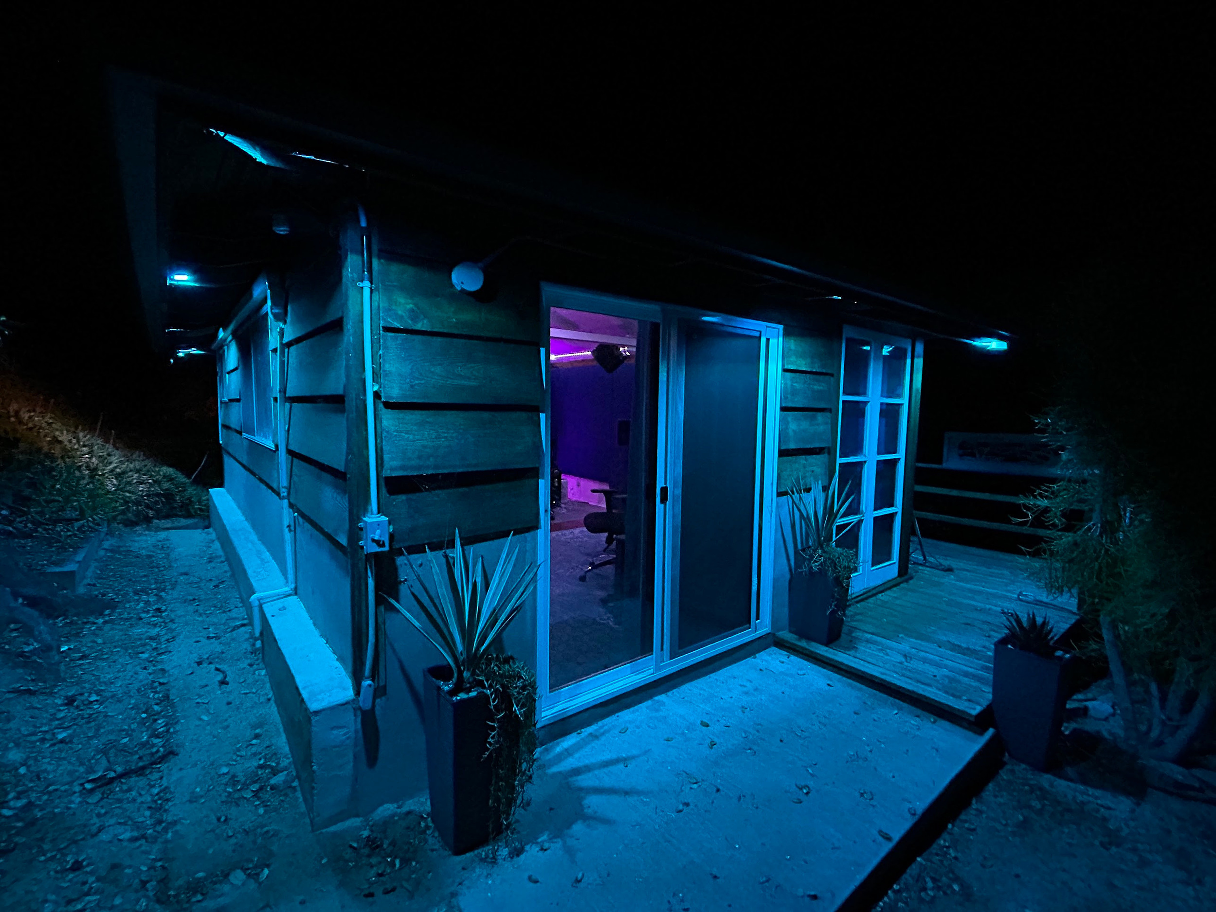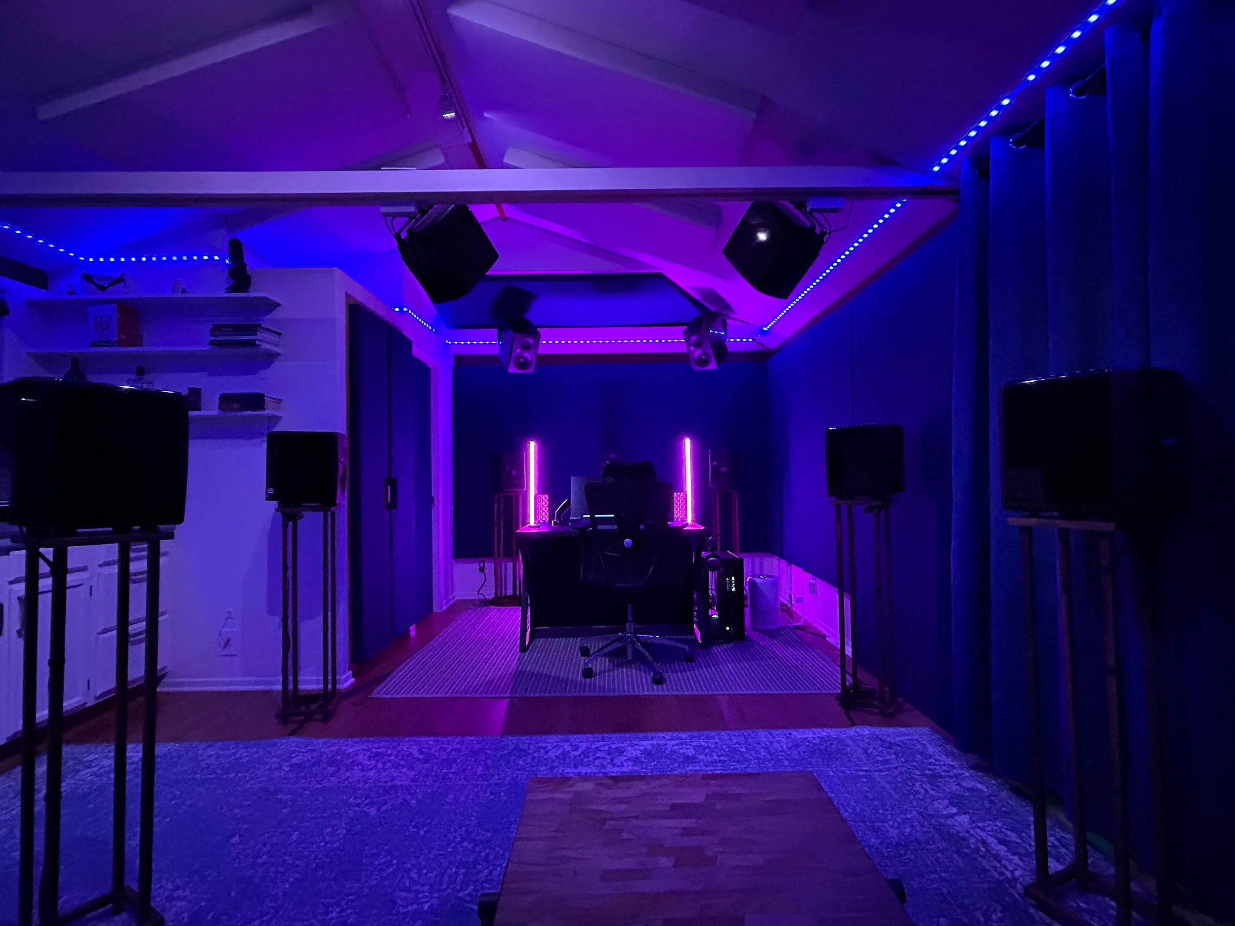 I made and installed custom sound panels for all the walls, added a beam in the ceiling, installed the upper speakers on custom brackets that I made, built custom walnut speaker stands, installed a color-changing LED light strip across the lower ceiling, stripped and repainted the kitchen cabinets, added light fixtures, built/painted/mounted custom shelves, added exterior LED lights on the outside of the cabin and in the patio, added a vinyl cover to the outside of the building. And far more!