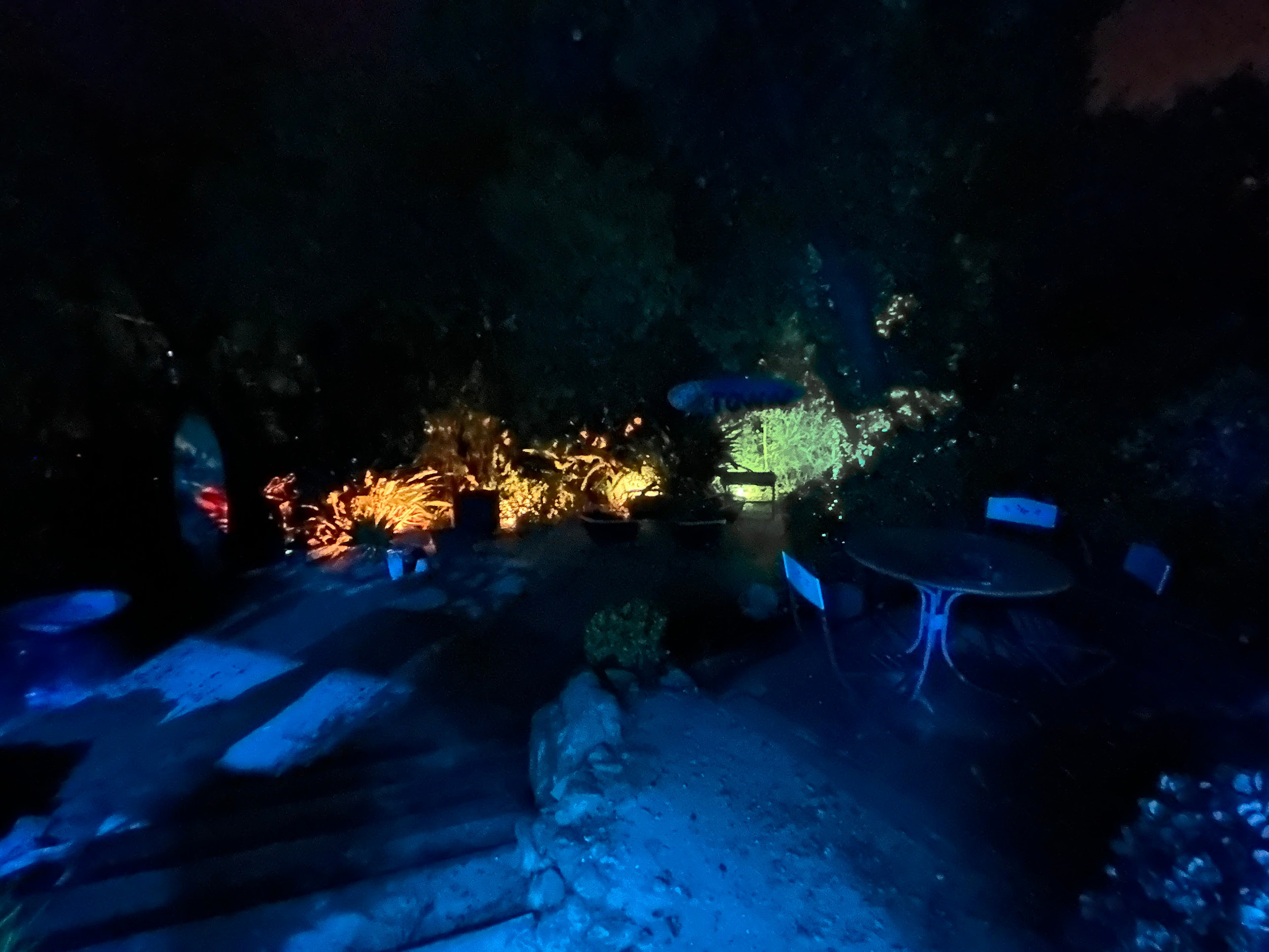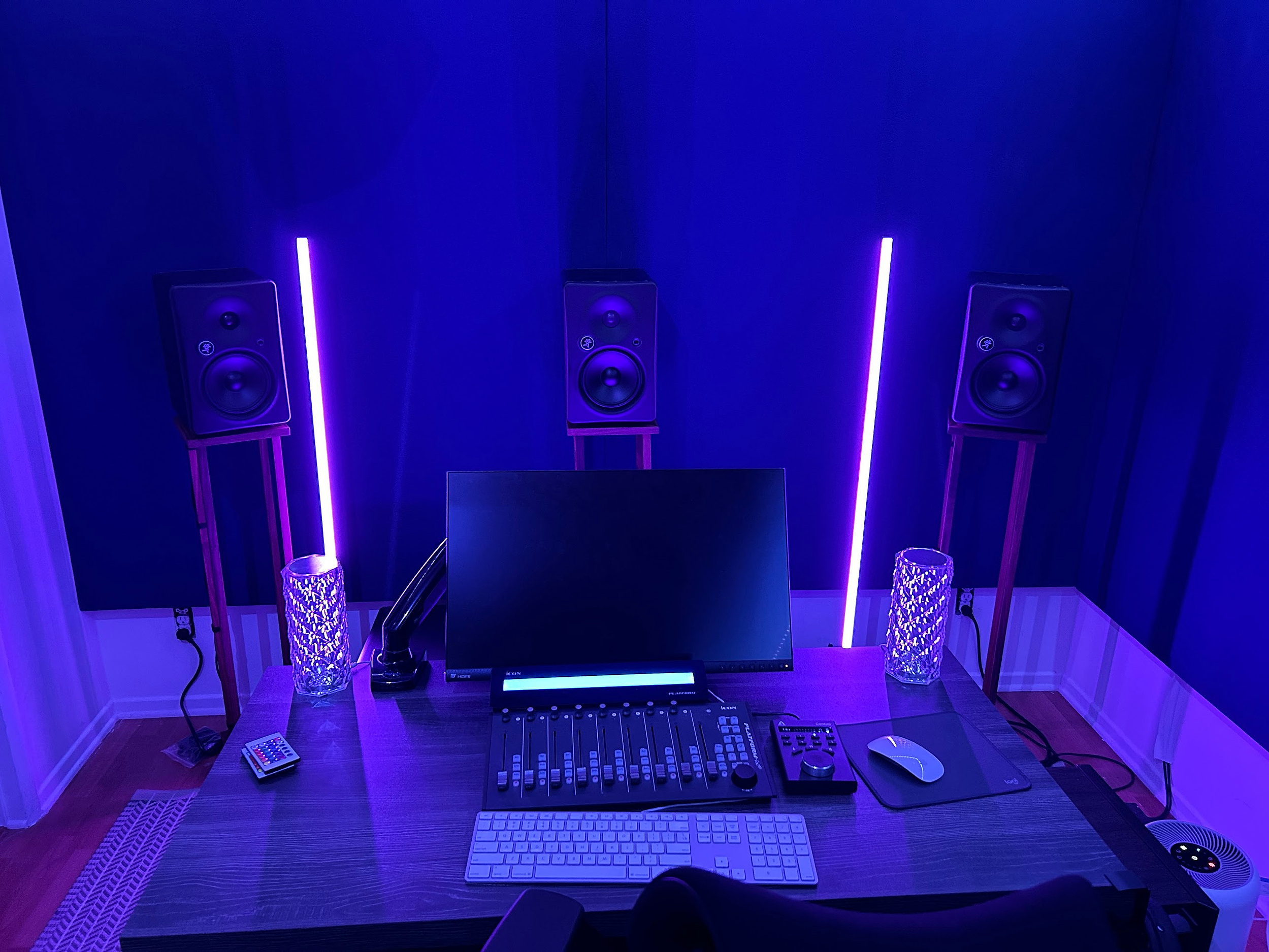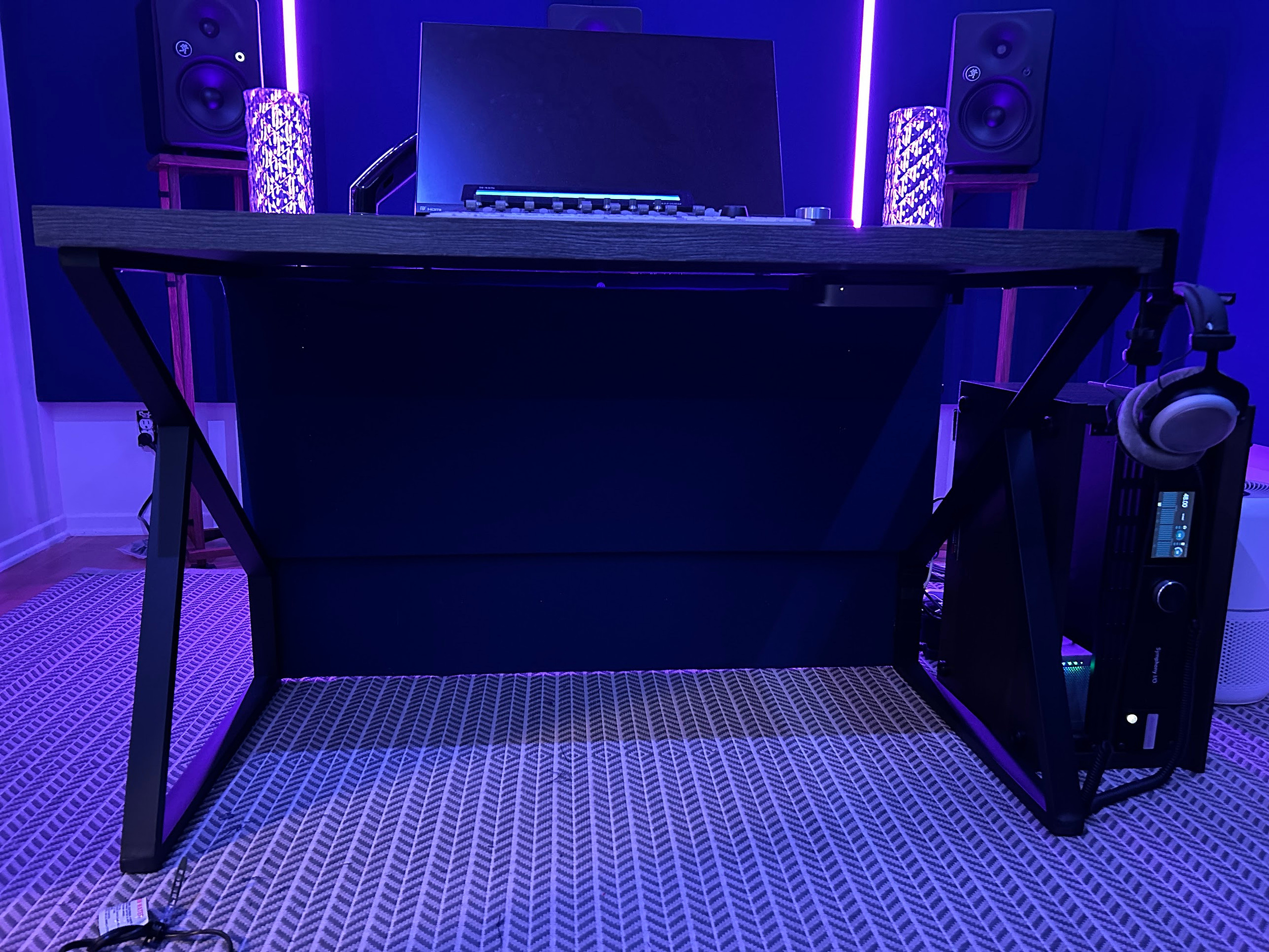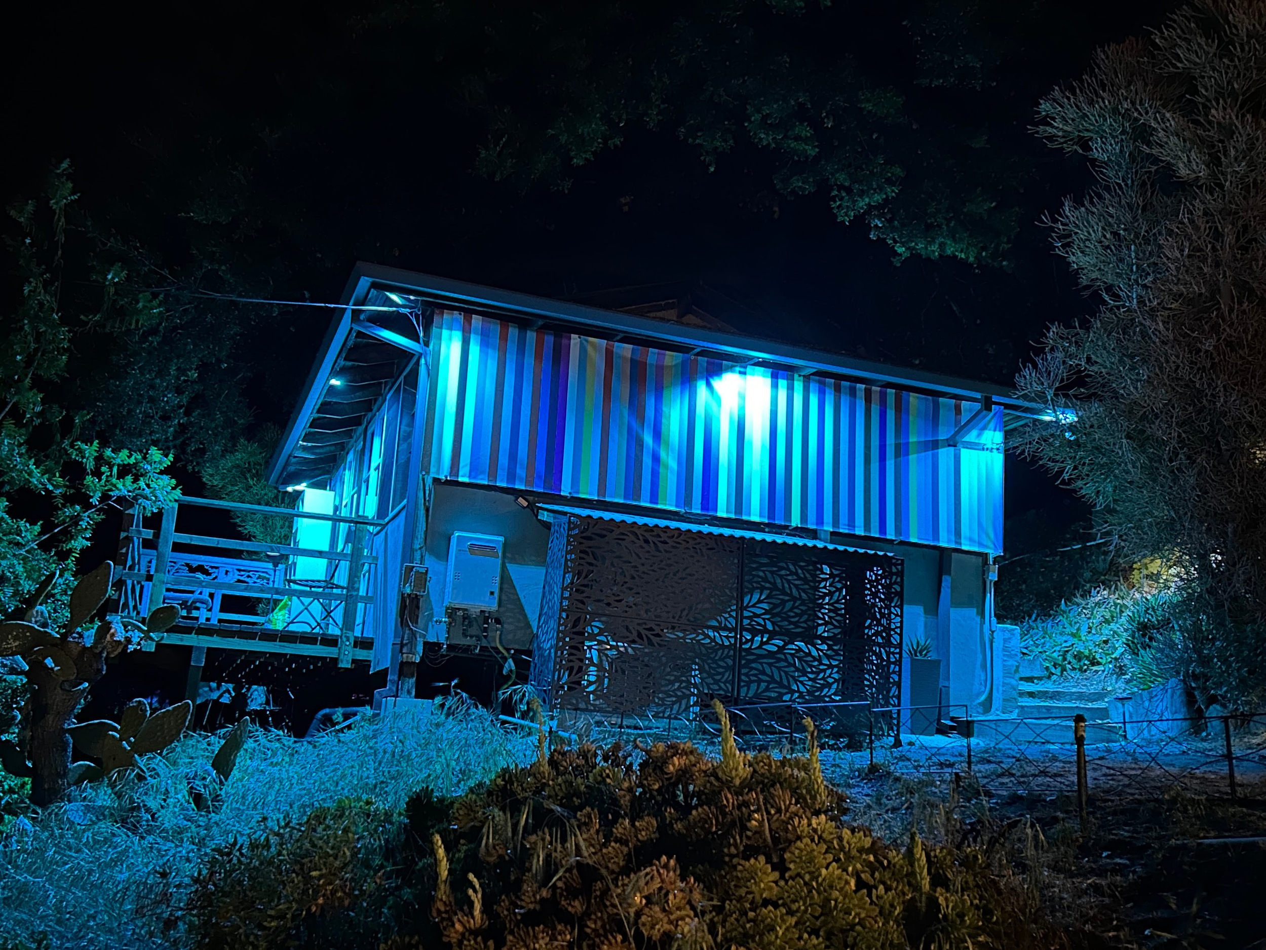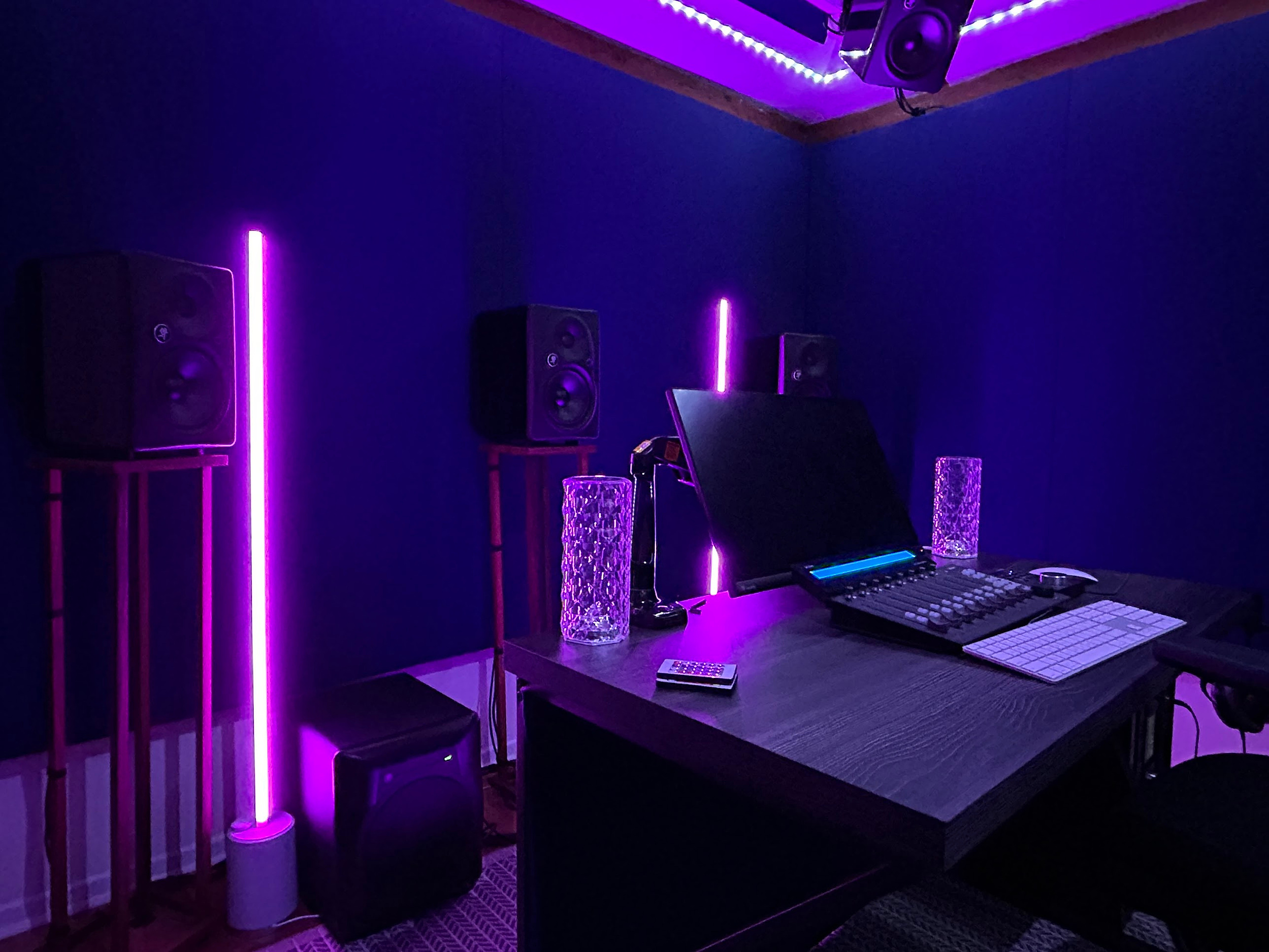 I made and installed custom sound panels for all the walls, added a beam in the ceiling, installed the upper speakers on custom brackets that I made, built custom walnut speaker stands, installed a color-changing LED light strip across the lower ceiling, stripped and repainted the kitchen cabinets, added light fixtures, built/painted/mounted custom shelves, added exterior LED lights on the outside of the cabin and in the patio, added a vinyl cover to the outside of the building. And far more!